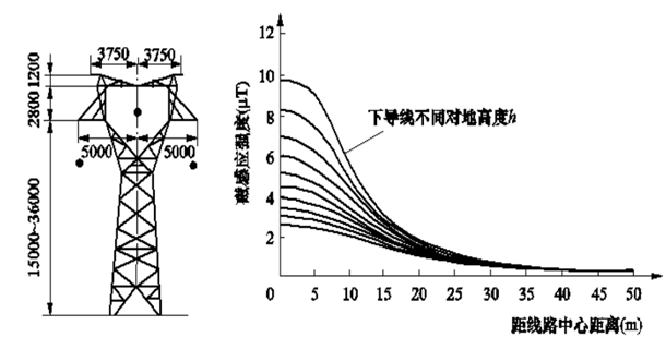 圖1列舉了220kV電壓等級,采用貓頭型鐵塔,三相單回路,導線呈三角型布置的輸電線路下,離地1m高度處的磁場橫向分布計算曲線。曲線以鐵塔中心線為坐標原點(O點),顯示了磁感應強度(磁通密度)隨距離的衰減關系。該圖曲線對應的計算線路電流為300A(采用LGJ—300鋼芯鋁絞線),圖中曲線自上至下對應導線對地計算高度h分別為8、9、10、11、12、13、14、15、16、17m。